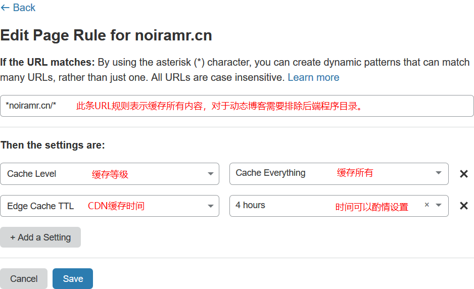 适用于静态博客(Gitpage),Wordpress用户请搜索排除后端程序的规则。页面规则(Page Rules)添加一条规则,用来缓存所有内容。