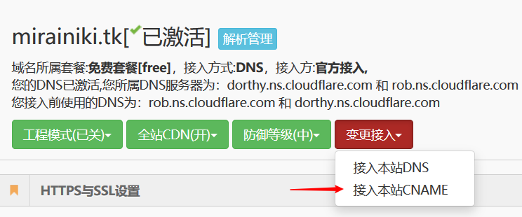 - 若已在CF中添加过域名,可在域名列表中找到并到解析设置中选择接入本站CNAME即可
