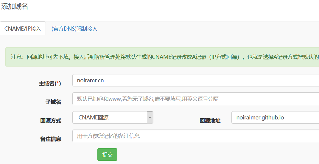 - 若未在官网申请过域名接入,可直接在CP添加域名。回源地址,静态博客(Gitpage)可以直接填写域名,如果使用自用主机,回源地址先不必填,提交后到“解析管理”把默认生成的CNAME记录改成A记录(IP方式回源)。